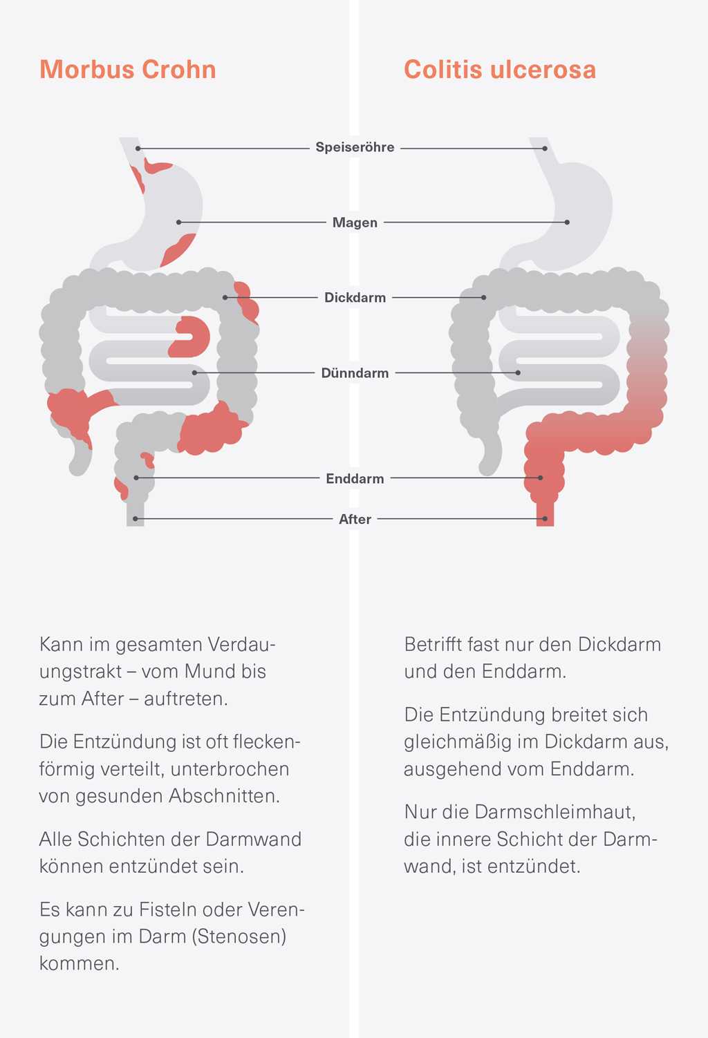 In der Graphik von abbvie care sind die Unterschiede sehr schön zu sehen und kurz beschrieben. Diese ist auf der Seite CED: Krankheitsbilder von abbvie care mit weiteren nützlichen Informationen und einer Info-Broschüre "CED bei Kindern und Jugendlichen" zu finden.